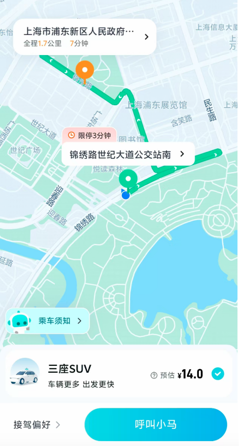 8月4日下午,证券时报记者来到上海市浦东新区花木街道上海科技馆南侧道路的“锦绣路世纪大道(上海科技馆)”公交站,用小马智行APP呼叫了一辆三座SUV的Robotaxi,行程终点为浦东新区人民政府3号门。约5分钟后,APP显示有车接单。